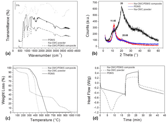 Comparison of the properties of neat polydimethylsiloxane (PDMS), sodium carboxymethylcellulose (Na–CMC) powder, and the Na-CMC/PDMS composite, in terms of: (a) Fourier Transform Infrared Spectroscopy (FTIR) spectra; (b) X-ray Diffraction (XRD) patterns; (c) thermogravimetric analysis (TGA) and (d) Differential Scanning Calorimetry (DSC) thermograms.