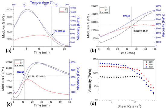 Rheological analysis on PDMS pellets: (a) dynamic rheological ramp test; (b) isothermal characterization at 190 °C and (c) at 205 °C; (d) viscosity vs. shear rate at different temperatures of interest.