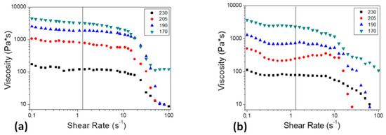 Viscosity vs. shear rate at different temperatures of interest for (a) neat PDMS and (b) composite Na–CMC/PDMS filaments.