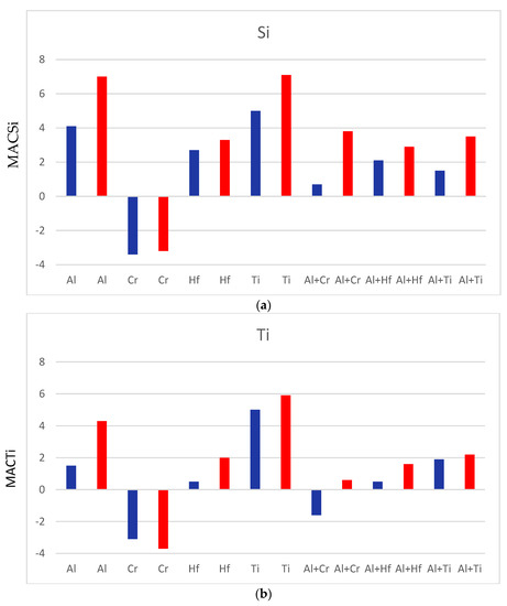 1. In both alloys there was macrosegregation of Si (MACSi) and Ti (MACTi). The simultaneous addition of Al, Hf, and Ti in the alloy NbSiTiHf-5Al resulted in the highest macrosegregation of Si.