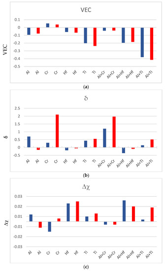 Effect of solute element(s) individually and in synergy on the parameters (ordinate) VEC, δ and Δχ of the Nbss in cast microstructures (blue colour) and in heat treated microstructures (red colour). Data is shown as the difference from the values of the alloys NbSiTiHf-5Al and NbSiTiHf-5Al-5Cr, for example, the effect of Al on the parameter VEC is VECAl = VECNbss NbSiTiHf-5Al − VECNbss YG3 = 4.586 − 4.679 = −0.093, similarly δAl = δNbss NbSiTiHf-5Al − δNbss YG3 = 4.34 − 3.64 = +0.7. The nominal composition of the alloy YG3 is Nb-24Ti-18Si-5Hf [26].