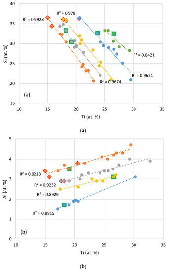 (a) Si versus Ti in Nb5Si3, (b) Al versus Ti in Nb5Si3, (c) Hf versus Nb in Nb5Si3. Squares and diamonds show data for the alloys NbSiTiHf-5Al-5Cr and NbSiTiHf-5Al, respectively. The data is for Nb5Si3 silicides in alloys studied in our research group (see [34] and [5,25]). In (a) series a (R2 = 0.9928) with alloying element additions of Al, Cr, Ge, Hf, Si, Sn, Ti; series b (R2 = 0.9674) Al, B, Cr, Ge, Hf, Mo, Si, Sn, Ta, Ti; series c (R2 = 0.978) Al, B, Cr, Ge, Hf, Si, Sn, Ta, Ti; series d (R2 = 0.9621) Al, B, Cr, Ge, Hf, Mo, Si, Ta, Ti; and series e (R2 = 0.8421) Al, B, Cr, Hf, Mo, Si, Sn, Ta, Ti. In (b) series a (R2 = 0.9218) with alloying element additions Al, B, Cr, Ge, Hf, Si, Sn, Ti; series b (R2 = 0.9232) Al, B, Cr, Ge, Mo, Si, Sn, Ta, Ti; series c (R2 = 0.8929) Al, B, Cr, Hf, Si, Sn, Ti; and series d (R2 = 0.9915) Al, B, Cr, Mo, Si, Sn, Ta, Ti. In (c) blue data points are for Nb5Si3 silicides with alloying element additions of Al, B, Cr, Ge, Hf, Si, Sn, Ti.