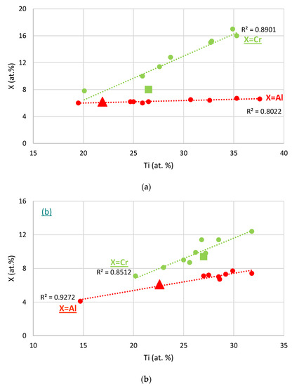 Data for solute element X=Al or Cr in Nbss (a) in cast and (b) heat treated KZ series alloys (data is shown by filled circles), and in the NbSiTiHf-5Al and NbSiTiHf-5Al-5Cr alloys. The data for X = Al or Cr in Nbss in NbSiTiHf-5Al-5Cr and NbSiTiHf-5Al is shown by squares and triangles, respectively. Data for X=Al or Cr are shown in red and green, respectively. The alloying elements in KZ series alloys are Al, Cr, Si, Ti, for alloy compositions see [25].