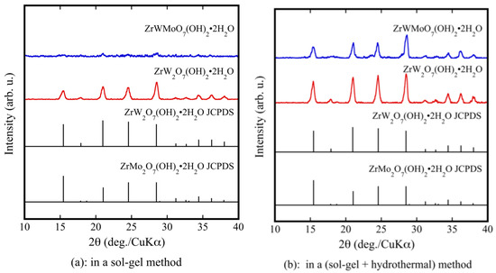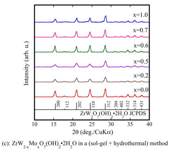 X-ray powder diffraction (XRD) patterns of ZrW2−xMoxO7(OH)2·2H2O precursor powders in a sol-gel method (a); and a sol-gel method combines with hydrothermal method (b,c).