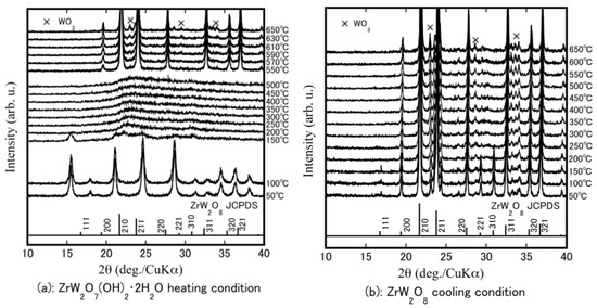 High temperature (HT)-XRD patterns of Zr–W–O system precursor at a temperature program of heating from 50 °C to 650 °C (a); and then cooling from 650 °C to 50 °C (b).