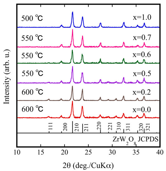 Using the results shown in Figure 2a, we performed multiple temperature comparison experiments to fabricate ZrW2−xMoxO8 sintered bodies by SPS. The optimum sintering temperature for each sample depended on various factors (relative density, crystallinity, etc.). Figure 3 shows the XRD patterns for each ZrW2−xMoxO8 sintered body under optimal sintering temperature conditions. The optimal sintering temperature depended on the Mo content: 600 °C for x = 0.0, 550 °C for x = 0.5, and 500 °C for x = 1.0. The ZrW2−xMoxO8 sintered bodies were pure phase and consistent with ZrW2O8. The 111, 221, and 310 reflections progressively diminished with increasing Mo substitution and almost disappeared when x ≥ 0.7. The reflection intensity decreased in the order of 111, 221, and 310 in accordance with the generation of β phase and substitution of W by Mo. These results suggest that the crystal phase of the ZrW2−xMoxO8 compound depends on the x value. When x was increased to 0.7 at room temperature, ZrW2−xMoxO8 completely converted to the β phase. The density of the obtained ZrW2−xMoxO8 sintered bodies and theoretical density are shown in Table 1. All sintered bodies with relative densities of more than 90% were obtained with a shorter heat treatment compared with the conventional sintering process. Thus, SPS is a promising method for densification of body structures as it promotes fast heating and fast cooling of sintered bodies.
