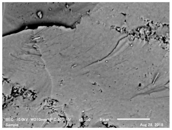 Figure 4 shows SEM images of the fractured surface of the sintered body. The SEM image shows that the sintered body was very dense. This is attributed to the applied pressure during SPS, which enhanced densification over grain-growth-promoting diffusion mechanisms. In addition, EDS point analysis of the fractured surface was performed to determine the composition of the black areas. A comparison of the elemental compositions of the black and bright areas revealed no significant change in the Zr, W, and O contents, indicating that the black areas were not impure substances.