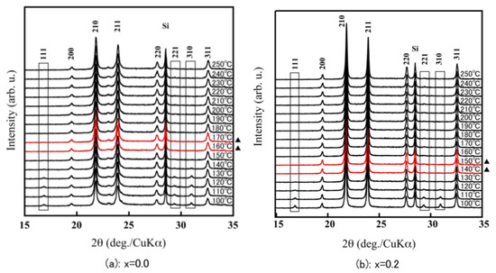 For the α-ZrW2−xMoxO8, the 111 reflection in the vicinity of 17° and the 221 and 310 reflections around 30° were clearly observed at room temperature. In contrast, for the β-ZrW2−xMoxO8, there were no reflections around 17° and 30°. Therefore, because of the existence of the 111, 221, and 310 reflections in the X-ray diffraction pattern, the phase transition temperature could be calculated from α phase to β phase from the high-temperature X-ray diffraction patterns (Figure 5). The phase transition temperature of ZrW2O8 corresponded to the previously reported temperature (around 160 °C–170 °C), that for x = 0.2 was slightly lower (140 °C–150 °C), and that for x = 0.5 was 70 °C–80 °C. These findings show that the phase transition temperature of ZrW2−xMoxO8 decreases with increasing Mo substitution. The disappearance of the 111, 221, and 310 reflections in the XRD pattern of ZrWMoO8 indicates that ZrWMoO8 exists in the β phase above room temperature.
