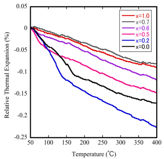 To investigate and identify the effect of Mo doping on the phase transition temperature and on the NTE coefficients, we measured the relative thermal expansion of ZrW2−xMoxO8 sintered bodies as a function of temperature. The results are shown in Figure 6. The downward trend of each curve with increasing temperature reflects the NTE property. The bending point in each curve is attributed to a change in the NTE coefficient, which corresponds to the occurrence of phase transitions in this study. These results show that the phase transition shifts to the lower temperature side as the Mo content is increased. The phase transition from α-phase to β-phase could be investigated when x ≤ 0.6, but not when 0.7 ≤ x within the measurement temperature range. The decrease in the phase transition temperature is attributed to the fact that the electronegativity of Mo (2.16) is less than that of W (2.36). This means that when the Mo content is gradually increased, the separation energy of W(Mo)–O gradually decreases, leading to a reduction in the phase transition temperature.