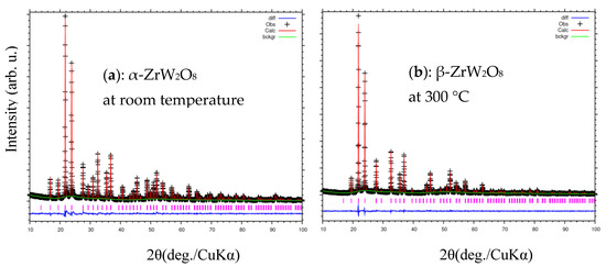 Rietveld refinement of X-ray diffraction patterns of ZrW2O8 at (a) room temperature; and (b) 300 °C.