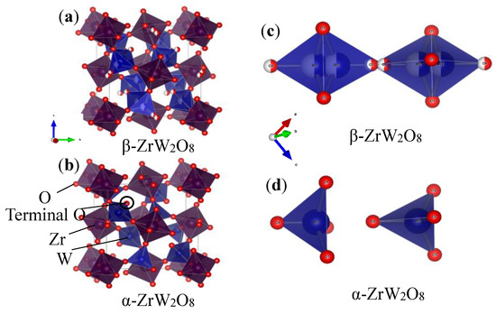 Crystal structure of (a) α phase and (b) β phase of ZrW2O8; WO4 groups in <111> direction of (c) α phase and (d) β phase of ZrW2O8.