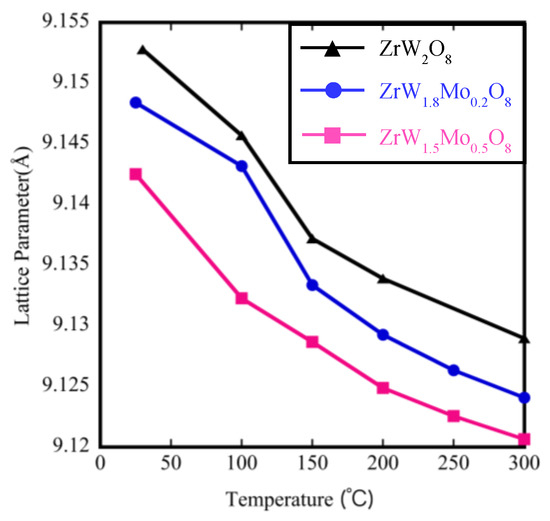 The temperature dependence of the lattice parameters on the Mo content derived from Rietveld refinement is shown in Figure 9. The lattice parameter for these samples clearly decreased with the increase in Mo content at the same temperature, which is reasonable given the smaller radius of Mo6+ (0.41 Å) compared with that of W6+ (0.42 Å). In addition, the lattice parameters of all samples contracted linearly with increasing temperature, indicating that the thermal expansion behavior is negative. The coefficient of thermal expansion calculated on the basis of the relationship between the temperature and lattice parameters is shown in Table 4. The NTE coefficients changed from −9.88 × 10−6 °C−1 to −5.35 × 10−6 °C−1 for ZrW2O8. The reduction in the β phase with the addition of Mo content is consistent with the decreasing trends of the TMA results (Table 2). We compared the NTE coefficients in Table 2 and Table 4 and found that the results of the two measurements differed. The reason for this difference is attributed to two factors. The first one is the presence of pores inside the sintered body, which could be roughly observed by SEM. The second one is the presence of systematic errors due to the use of different instruments, temperature controllers, and high-temperature furnaces.