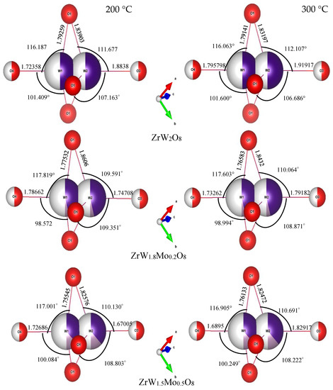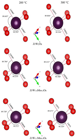 A noteworthy finding is that the bond lengths of W(Mo)1–O4 and W(Mo)2–O3 not only varied greatly with the temperature (from 200 °C to 300 °C), but also varied greatly with the Mo content. This may be related to the one-coordination of O3 and O4 atoms. Different W(Mo)–O bond lengths in different directions indicate stronger distortion in the polyhedra. Two factors necessary for distortion of a polyhedron are quadratic elongation (λ) and bond angle variance (σ2) [27]. The variance values of the distortion constants λ and σ2 between 200 °C and 300 °C are shown in Figure 12. We can see that the ZrO6 octahedron is basically in an undistorted state, which is attributed to all bond lengths Zr–O1 being equal and all bond angles being close to 90°. In the W(Mo)2O8 polyhedron, the degree of distortion increased greatly with the temperature because of the instability of the one-coordinate oxygen atoms. The degree of distortion gradually decreased with increasing Mo content, resulting in a decrease in the NTE coefficient.