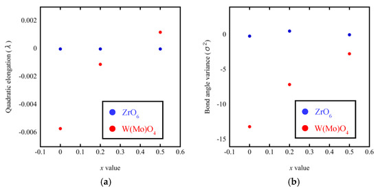 Quadratic elongation (a) and bond angle variance (b) of ZrO6 and W(Mo)2O8 polyhedra in ZrW2−xMoxO8.