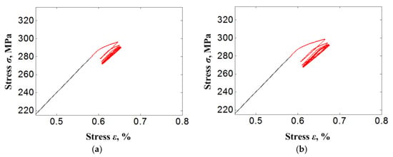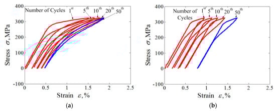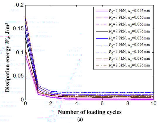 From Figure 2c,d and Figure 3c,d, it can be seen that the ratcheting strains and dissipation energy Wd decrease with an exponential function law during the cycle loadings. After certain numbers of cycles, both the ratcheting strains and dissipation energy show an apparent quick decrease to a stable value. These findings also agree with the conclusions presented by Kang [33].