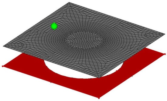 The Finite Element (FE) model used for the numerical simulation of the process can be seen in Figure 3. The forming tool and the backing plate were simulated as analytical rigid surfaces in order to perform an efficient numerical contact analysis. The polymer sheet is discretized employing 2052 S4RT elements with reduced integration to avoid the hourglassing, with an active degree of freedom to capture the variation of the temperature at nodes throughout the thickness by bilinear interpolation. The number of integration points used to capture the temperature variation throughout the thickness was 5. The mesh was generated taking into account the tool path that defines the final shape of the part. It was generated uniformly through angle and radius coordinates in order to maintain elements aligned and to generate minimal distortion during the polymer sheet deformation and thickness reduction. The minimum element length in the model was 3 mm, obtaining a minimum stable time increment of 1.2 ×10−6 s that is small enough to avoid instabilities during the entire simulation. Note that, mesh size influences the approach accuracy, nevertheless the authors selected the element size in order to limit the computational time to 10 h (for an Intel Core i8 CPU) maintaining an adequate concordance with the experimental results. The contact between the plastic shell and the forming tool was simulated by surface-to-surface interaction with penalty tangential behavior and hard contact behavior for normal direction.