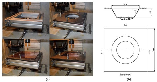 Setup for SPIF: (a) CNC machine with fixing system; (b) Shape of processed sheet.
