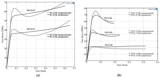 Experimental behavior and calibrated model results at different temperatures for PC (a) and PVC (b).