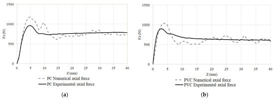 Numerical and experimental axial force profile. (a) PC process conditions: Cone shape, α = 60°, D = 12 mm and Δz = 0.8 mm; (b) PVC process conditions: Cone shape, α = 60°, D = 10 mm and Δz = 0.6 mm.