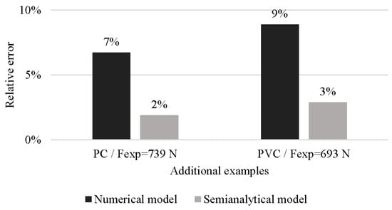 Relative error of the estimation for additional tests. Process conditions: Cone shape, α = 60°, D = 10 mm and Δz = 0.8 mm.