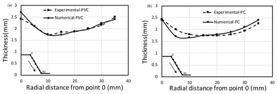 Thickness evolution respect to radial distance, (a) PVC and (b) PC. Process conditions: Cone shape, α = 60°, D = 10 mm and Δz = 0.8 mm.