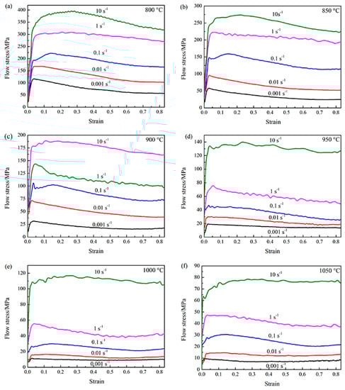 Flow stress curves of isothermally compressed Ti-6Al-4V alloy at different deformation temperatures: (a) 800 °C; (b) 850 °C; (c) 900 °C; (d) 950 °C; (e) 1000 °C; (f) 1050 °C.