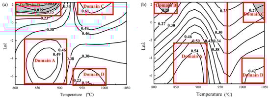 Then, the values of η and ξ can be easily derived by combining Equations (6), (7) and (10). Eventually, the processing map was established, as shown in Figure 2a. The contour numbers represent the values of η and the shaded regime is the unstable domains with negative ξ values. In Figure 2a, the processing map is divided into four domains. Domain A approximately lies in the temperature and strain rate range of 825–910 °C and 0.001–0.1 s−1. The power dissipation efficiency η is about 0.49 in the domain. Domain B approximately locates in the range of 800–900 °C and 3–10 s−1. The values of ξ is negative in the domain. Domain C is approximately in the range of 930–1020 °C and 3–10 s−1. The peak efficiency η is 0.61 in the domain. Domain D approximately spreads over the range of 930–1000 °C and 0.001–0.01 s−1. The power dissipation efficiency η is about 0.2 in the domain.