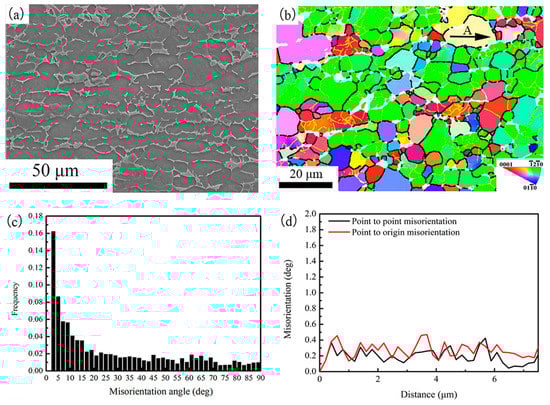 The SEM image and IPF (inverse pole figure) map of the as-received specimen are shown in Figure 3a,b, respectively. The grains are elongated in rolling direction. The average grain size is 15 μm in length direction and 6 μm in transverse direction. Figure 3b also shows the low-angle boundaries (LABS, depicted by yellow line) and high-angle boundaries (HABS, depicted by black line) of the as-received specimen. A large number of LABS were observed. Figure 3c shows the misorientation distribution. It also indicates most boundaries are LABS. The misorientation profile inside the grain along the arrow A in Figure 3b was evaluated and the results are shown in Figure 3d. Fluctuations in both local misorientation (point-to-point) and cumulative misorientation (point-to-origin) were observed and the maximum misorientation is less than 0.6°. It indicates that the grains are strain-free recrystallized structure. Thus, the crystal structure of the as-received specimen consists of the recovered and recrystallized structures.