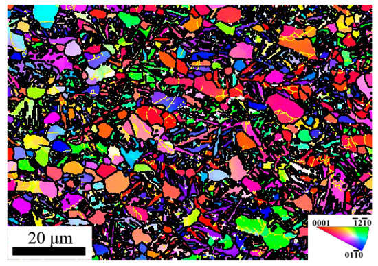 The IPF map of compressed specimen corresponding to the Domain A is represented in Figure 4. Substantial fine and equiaxed DRX grains were found in this domain, which is consistent with the higher efficiency of power dissipation 0.54. Meanwhile, significant flow softening was observed in flow curves of Figure 1c since the dynamic softening caused by DRX exceeds work hardening. Thus, DRX is the main microstructural mechanism in this domain. So, this domain was considered to be the optimal hot working window.