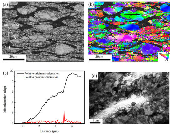Figure 5a,b,d show the IQ (image quality) map, IPF map and TEM graph of specimen deformed in the domain B. It can be observed that some parts of the regions are black in Figure 5a,b, because these regions have undergone severe lattice distortion and this cannot be resolved by EBSD. Meanwhile, many fine grains were observed due to boundary splitting associated with instability between interphase α/β boundaries and intraphase α/α boundaries in Figure 5a,b. In Figure 5a, a large amount of parallel deformation directions, oriented 45° to compression axis microbands, were observed within grains. It indicates that the localized shear deformation across α phase is the main reason for the formation of intraphase α/α boundaries. The misorientation profile along the arrows of D in Figure 5b, is shown in Figure 5c. It can be observed that maximum cumulative misorientation within the deformed grains exceeds 19°, which is much larger than that of the initial state. Many fine grains were also observed in the TEM graph of Figure 5d. Thus, flow localization is the main instability mechanism in this domain.