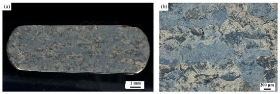 (a) Macrostructure image and (b) central region photo of Figure 6a on higher magnification of specimen compressed at 1050 °C and 10 s−1.