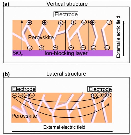 - Kwon, K.C.; Hong, K.; Van Le, Q.; Lee, S.Y.; Choi, J.; Kim, K.-B.; Kim, S.Y.; Jang, H.W. Inhibition of Ion Migration for Reliable Operation of Organolead Halide Perovskite-Based Metal/Semiconductor/Metal Broadband Photodetectors. Adv. Funct. Mater. 2016, 26, 4213–4222. [Google Scholar] [CrossRef]
