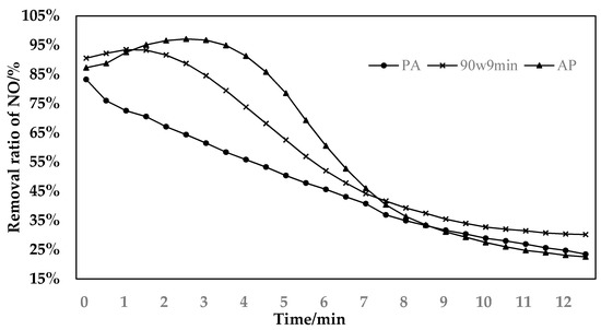 As can be seen from Figure 3, the NO removal effect of sludge activated by LiOH for 4 h is the best, and the NO removal effect of sludge activated for 6 h is the worst. Within 10–20 min of the reaction, sludge activated after 4 h had a significantly higher NO removal rate and continuity, than sludge activated after 2 h and 6 h. The reason is that when the alkali activation time is 2 h, the activation time is too short, and LiOH and the sludge cannot fully react. The amount of effective pore structure formed by the sludge is less, so the desired activation effect cannot be achieved, and sufficient active sites cannot be formed. As the activation time increases, the activation efficiency becomes higher and higher, and the degree of activation gradually deepens. As a result, more and more effective pores have been formed, so the denitration effect has gradually increased. However, as the activation time becomes longer, LiOH will destroy the previously formed micro-porous structure. The pores collapse, destroying the original effective pore location. Therefore, the effect of denitration decreased significantly. In summary, the appropriate activation time is particularly advantageous for the activation effect. If the time is too long or too short, proper active sites cannot be formed. Therefore, the optimal activation time for screening LiOH was 4 h [31].