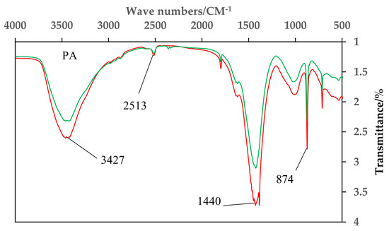 From Figure 5, there is a stretching vibration band of –NO at 874cm–1, and a stretching vibration band of –NO2 at 1440cm–1. Both of these groups are from the organic matter in the sludge. The catalyst prepared by plasma roasting before LIOH activation (referred to as PA catalyst) has a weaker stretching vibration of the –OH functional group. Based on this, it can be speculated that this is the oxidation mechanism of SCO. The denitration efficiency of the PA catalyst is low. The reason is that the concentration of basic functional groups on the surface of the catalyst is low, so NO2 cannot be completely adsorbed by the basic functional group. When all the NO adsorption sites are covered by the NO2 formed in the late stage of the reaction, the denitration effect is significantly reduced. The AP catalyst however, has high denitration efficiency. This is due to the high concentration of surface-OH basic functional groups of the sludge catalyst. Therefore, NO2 is easily adsorbed by a basic functional group, thereby releasing a large amount of NO adsorption sites. This process promotes the continuous adsorption of NO on the sludge surface, and the denitration rate is significantly improved [33].