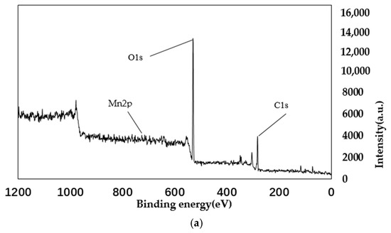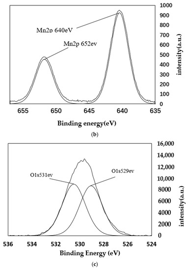 From the main spectra of Figure 8 and Figure 9, it can be seen that the main elements contained in the PA catalyst are oxygen, carbon, and manganese. The manganese is loaded by equal volume impregnation. As can be seen from the Mn spectrum, there are two peaks of manganese metal on the surface of the catalyst. The two peaks are Mn2p3/2 and Mn2p1/2. This shows that there are two manganese oxides with different valences in the catalyst. Among them, the Mn2p3/2 peak, with a binding energy of 641 eV, represents MnO2; and the Mn2p1/2 peak, with a binding energy of 652 eV, represents Mn2O3. As can be seen from the figure, before and after the reaction, the main Mn oxides formed in AP catalyst are MnO2 and Mn2O3. Comparing Figure 8 and Figure 9, it can be seen that as the reaction proceeds, the amount of Mn4+ increases, while the amount of Mn3+ decreases, eventually leading to a decrease in denitration efficiency. It can be concluded that Mn2O3 plays a major role in the reaction. From the spectrum in Figure 8c of the O element, it can be seen that the lattice oxygen is at 529 eV, and the chemisorbed oxygen is at 531 eV and 533 eV. It can be seen that lattice oxygen accounts for a large proportion. It can also be seen that chemisorbed oxygen accounts for a large proportion. Comparing Figure 8 and Figure 9, it can be seen that the lattice oxygen and the chemisorbed oxygen are greatly reduced after the reaction. However, the reduction ratio of chemisorbed oxygen is less than the reduction ratio of lattice oxygen. This shows that it is mainly lattice oxygen that plays a role during the reaction [36,37].