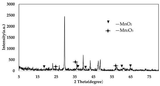 From the PA catalyst XRD pattern in Figure 11, it can be seen that the characteristic peaks of the MnO2 crystal form appear at the θ angles of 17.78°, 28.83°, 37.73°, 57°, and 70.88°. The characteristic peaks of the Mn2O3 crystal form appear at the θ angles of 25.01°, 33.81°, and 50.85°. It can be concluded that the Mn oxides on the PA catalyst surface are mainly MnO2 and Mn2O3. These indicate that the prepared catalyst surface has a good Mn oxide crystal form. This enables the sludge catalyst to have good catalytic activity for the selective catalytic oxidation of NO [40].