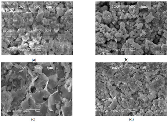 The dried sludge contains a large amount of organic matter, and its surface contains a large number of pore-like structures. However, if it is prepared as a denitration catalyst carrier, the organic matter is easily generated in a heated environment, thereby affecting the removal of NO by the catalyst. Therefore, before preparation of the catalyst, the dried oil sludge is alkali activated. This process will corrode a large amount of the organic matter in the oil sludge, and etch more pore-like structures on the surface. Moreover, after being adsorbed on the surface of the alkali activated dry sludge, NO reacts with O2 to form NO2 [16]. The generated NO2 is easily adsorbed by a basic functional group. This will result in a good desorption of NO2 on the surface of the sludge, eventually releasing the active sites used to adsorb NO. This promotes the continuous adsorption of NO on the surface of the sludge, so that the reaction continues, and the denitration rate is significantly improved [17,18,19].