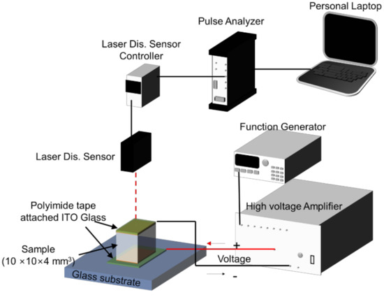 The actuation test was carried out using a laser displacement sensor (Keyance LK-G85, Tokyo, Japan), a high voltage amplifier (Model 10/10, Trek, Lockport, NY, USA) and a function generator (33220A, Agilent, Santa Clara, CA, USA). Figure 1 shows the schematic setup of the actuation test. Before conducting the actuation test, the hydrogel specimens (10 × 10 × 4 mm3) were equilibrated in DI water for 24 h and kept between two electrodes (polyimide tape attached to indium tin oxide coated glass (ITO glass)). A high voltage was applied on the electrodes via the function generator and the high voltage amplifier. The displacement of the hydrogel specimen was measured using the laser displacement sensor along with a data acquisition system (Pulse, B&K, Nærum, Denmark) connected to personal laptop. The actuation test was conducted at a constant environmental condition (25 °C, 95% RH) using an environmental chamber.