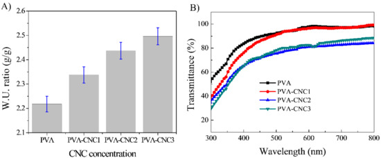 (A) Water uptake capacity of pure PVA and PVA-CNC hydrogels and (B) Optical transparency of the pure PVA and PVA-CNC hydrogels.