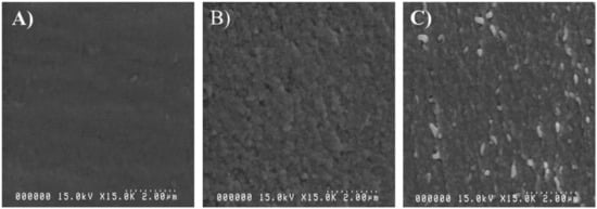 The SEM images of PVA-CNC3 hydrogel were taken to observe the morphology of the hydrogel. Figure 3A,B shows the surface morphologies of the pure PVA and PVA-CNC3 hydrogel, respectively. The pure PVA showed a smooth surface morphology, meanwhile the CNC-incorporated PVA-CNC3 hydrogel exhibited a uniform but rough surface. The CNCs were shown to be well-dispersed in the hydrogel. The cross-sectional SEM image of the PVA-CNC3 hydrogel (Figure 3C) showed that the rod-shaped CNCs were dispersed in the cross-sectional image of the hydrogel. This uniform dispersion might be associated with the interaction between the PVA and the CNC.