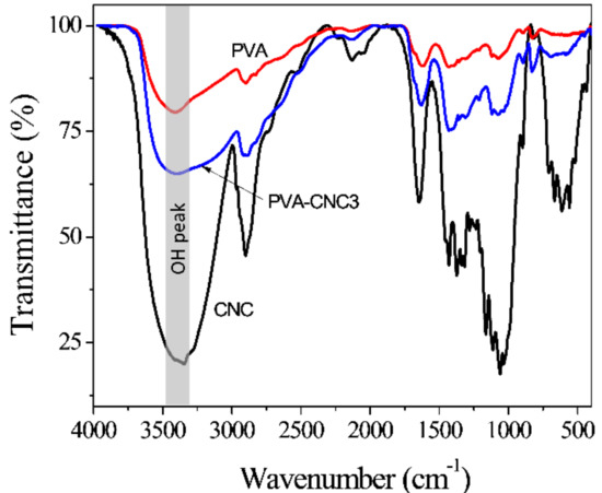 FTIR spectroscopy was used to study the transmission of light and the interaction of CNCs of the prepared PVA-CNC hydrogels. For the FTIR analysis, the samples were completely dried in a vacuum oven at 60 °C for 6 h. The FTIR spectra were recorded on a FTIR spectrometer (Bruker Optics, Billerica, MA, USA) with the range of 400–4000 cm−1 using the KBr disk pellet method and averaging 16 scans.