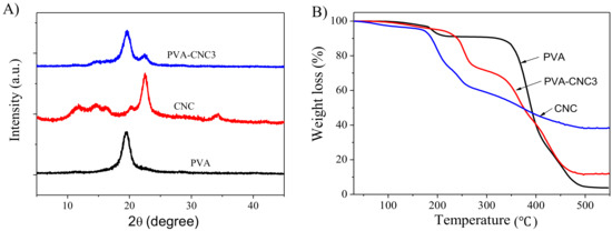 (A) X-ray diffraction patterns of CNC, PVA, and PVA-CNC3 hydrogel, (B) TGA curves of the pure PVA, CNC and PVA-CNC3 hydrogel.