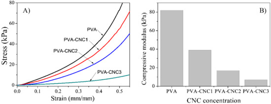 (A) Compressive stress–strain curves of PVA, PVA-CNC composite hydrogels and (B) compressive modulus.