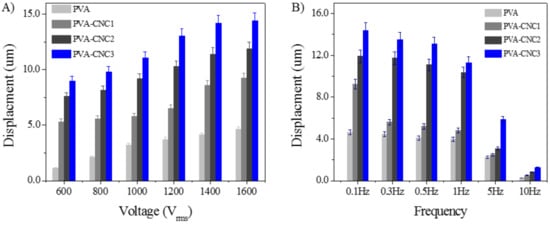 Actuation results for the pure PVA and PVA-CNC hydrogels: (A) actuation voltage variation at 0.1 Hz and (B) actuation frequency at 1.0 kV.