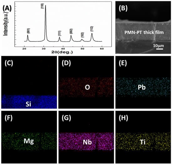 The film’s X-ray diffraction (XRD, XRD-7000, Shimadzu Coprporation, Kyoto, Japan) pattern is shown in Figure 1A. It is clear that the obtained PMN-PT thick film is in a well-crystallized perovskite structure. No pyrochlore second phase can be detected. As shown in Figure 1B, the PMN-PT thick film on the Si wafer is highly dense and crack-free. Its porosity is around 96.7% and its thickness is approximately 25 μm. In Figure 1C–H, it is easy to see that the substrate is a silicon wafer. The elements O, Pb, Mg, Nb and Ti are distributed in the film, indicating that the obtained thick film is indeed PMN-PT.