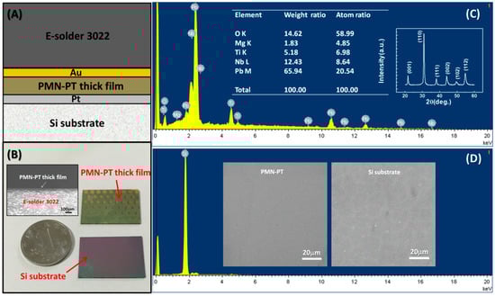 (A) The schematic diagram of PMN-PT thick film on platinum-buffered Si substrate after E-solder 3022 deposition; (B) photograph of PMN-PT thick film and Si substrate after transfer process, the inset: SEM morphology of PMN-PT thick film on E-solder 3022; EDS analysis results of newborn surfaces of (C) PMN-PT thick film and (D) Si substrate. The inset: XRD pattern of PMN-PT film after transfer; SEM surface image of PMN-PT film and Si substrate.