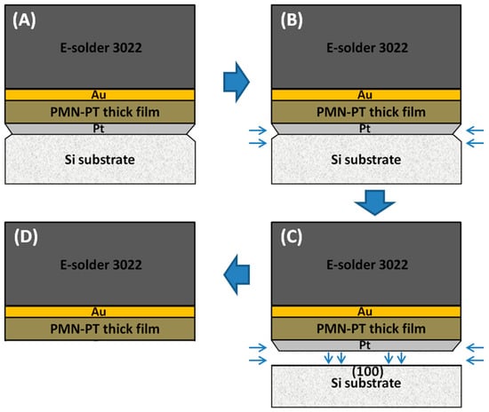 The schematic diagram of PMN-PT thick film transfer process: (A) after dicing; (B) etching; (C) after etching; (D) after transfer.