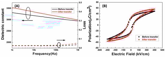 (A) Frequency dependent dielectric properties and (B) ferroelectric properties of the PMN-PT thick film before and after transfer.