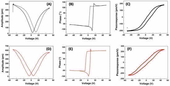 (A) Amplitude-voltage; (B) phase-voltage and (C) piezoelectric hysteresis loops of PMN-PT film before transfer; (D) amplitude-voltage; (E) phase-voltage and (F) piezoelectric hysteresis loop of PMN-PT film after transfer.