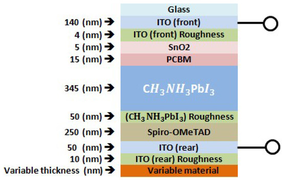 Our targeted device in this work is the regular structure of n-i-p semi-transparent CH3NH3PbI3 perovskite solar cell (area = 0.1–1 cm2) with an architecture of glass/ITO-front/SnO2/PCBM/CH3NH3PbI3/spiro-OMeTAD/ITO-rear. A schematic model of the semi-transparent perovskite solar cell used in our transfer-matrix-based optical simulations can be seen in Figure 1.